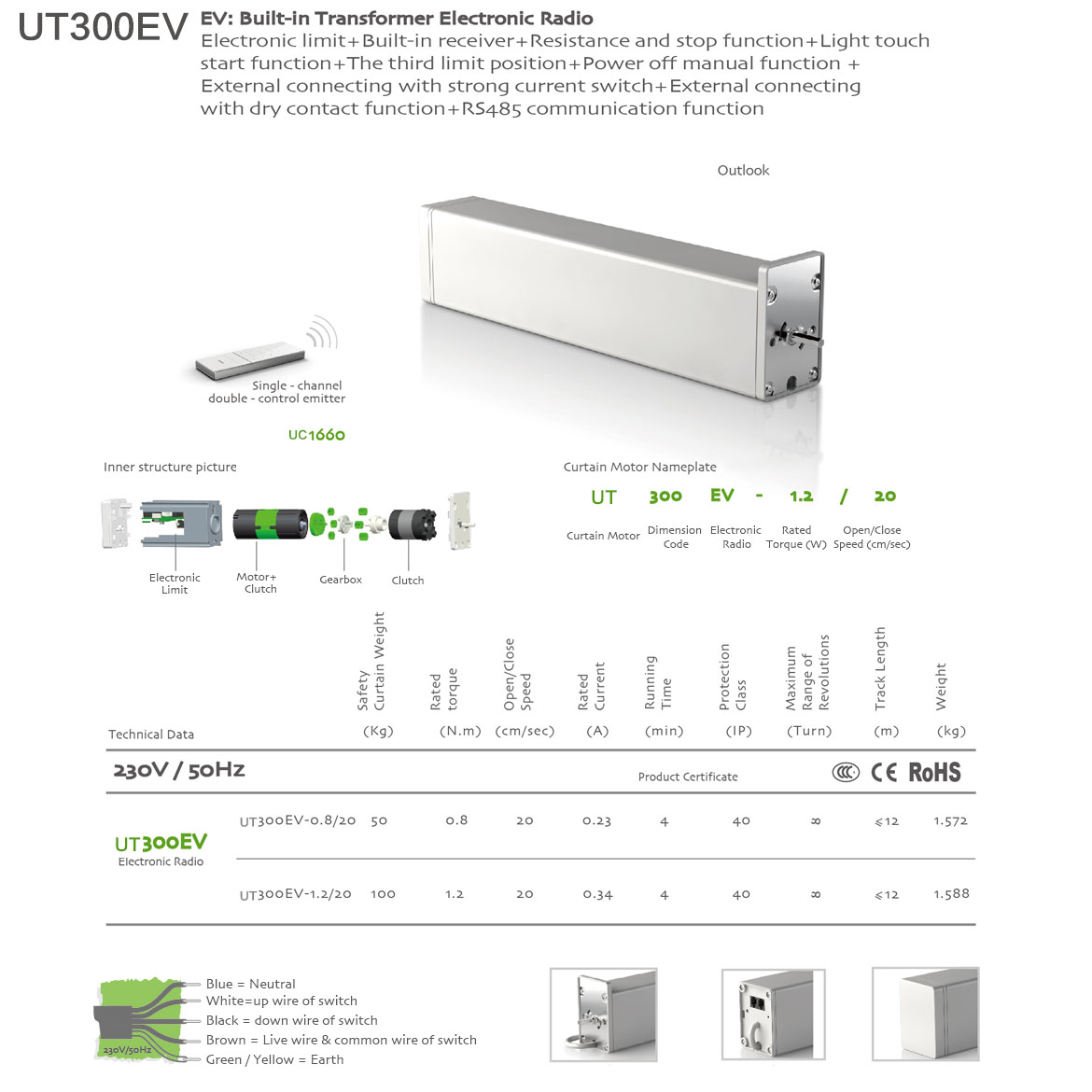 Memorized Limit+Integrated Radio Control+Obstruction Detection+Light touch-start+Manual Override+The third limit position+Compatible with dry contact switch function+Compatible with mains voltage switch+Compatible with hotel room card system+RS485 communication function.